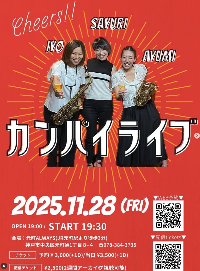 | 28日(金) | カンパイライブ![]() sax西村伊代、永田亜由美 pf小浜早佑梨 Open19:00 Start 19:30 Charge (要別途1drオーダー) ご予約¥3,000/当日¥3,500 配信視聴チケット¥2,500 https://passmarket.yahoo.co.jp/event/show/detail/010xvczy1xn41.html |