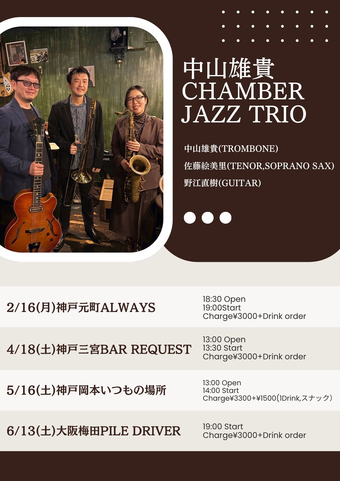 | 13日(金) | 浅井良将(alto) 加納新吾(piano) 森下啓(drums) Open18:30 Start 19:00 Charge (要別途1drオーダー) 一般¥3,500/学生¥2,000 |