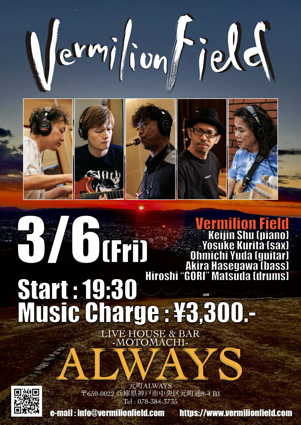 | 6日(金) | Vermilion Field![]() 朱恵仁(p) 栗田洋輔(sax) 湯田大道(g) 長谷川晃(b) 松田”GORI”広士(ds) Open19:00 Start 19:30 Charge ¥3,300 (要別途1drオーダー) |