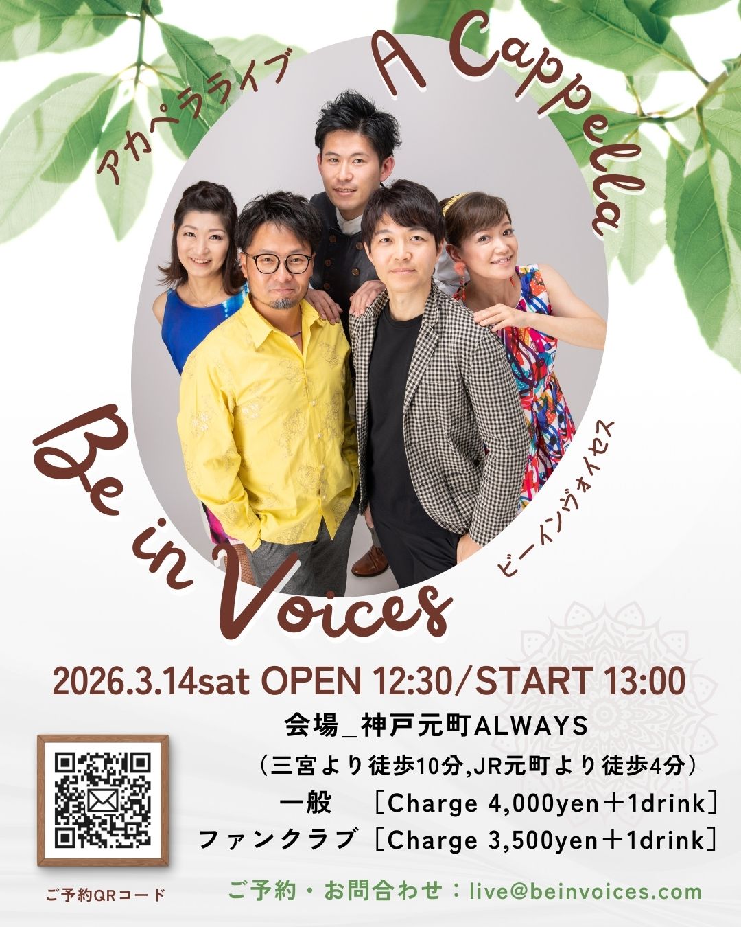 | 14日(土)昼 | Be in Voices![]() Open12:30 Start 13:00 Charge (要別途1drオーダー) 一般 ¥4,000 /ファンクラブ¥3,500 |