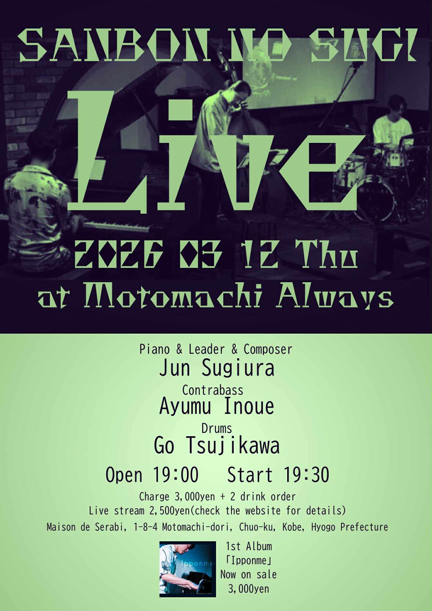 | 12日(木) | SANBON NO SUGI![]() 杉浦潤(pf) 井上歩(ba) 辻川郷(ds) Open19:00 Start 19:30 Charge ¥3,000 (要別途2drオーダー) |