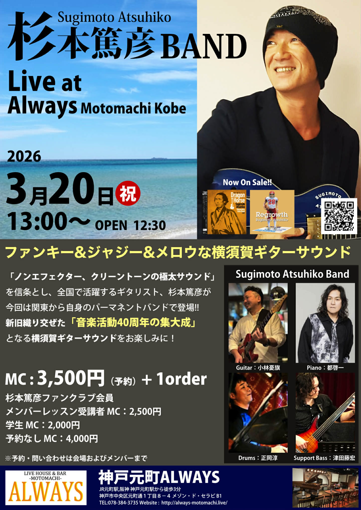 | 20日(金)昼 | 杉本篤彦BAND![]() 杉本篤彦(gt) 都啓一(key) 小林憂旗(gt) 津田藤宏(b) 正岡ジュン(ds) Open12:30 Start 13:00 Charge (要別途1drオーダー) 当日¥4,000 /ご予約¥3,500 |