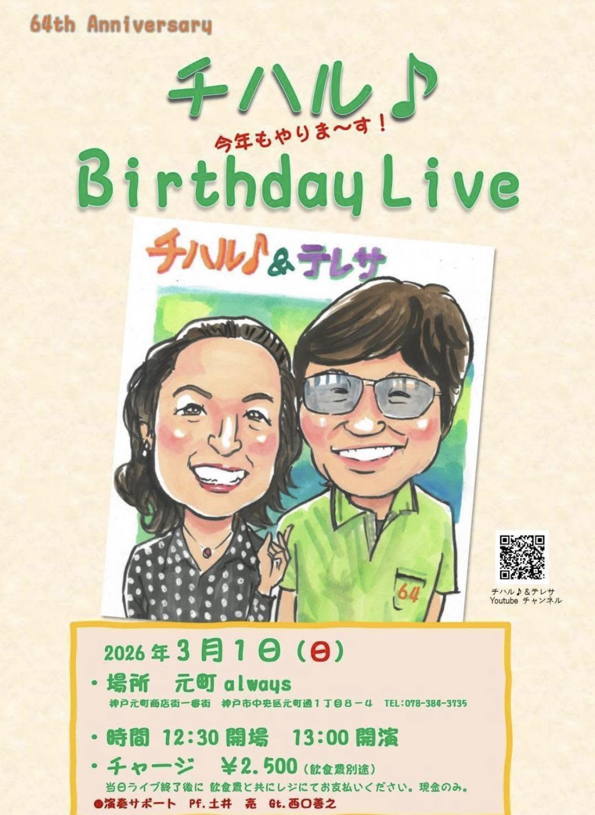 | 1日(日)昼 | チハル&テレサ チハルBirthday Live ![]() Open12:30 Start 13:00 Charge (要別途1drオーダー) ¥2,500 |