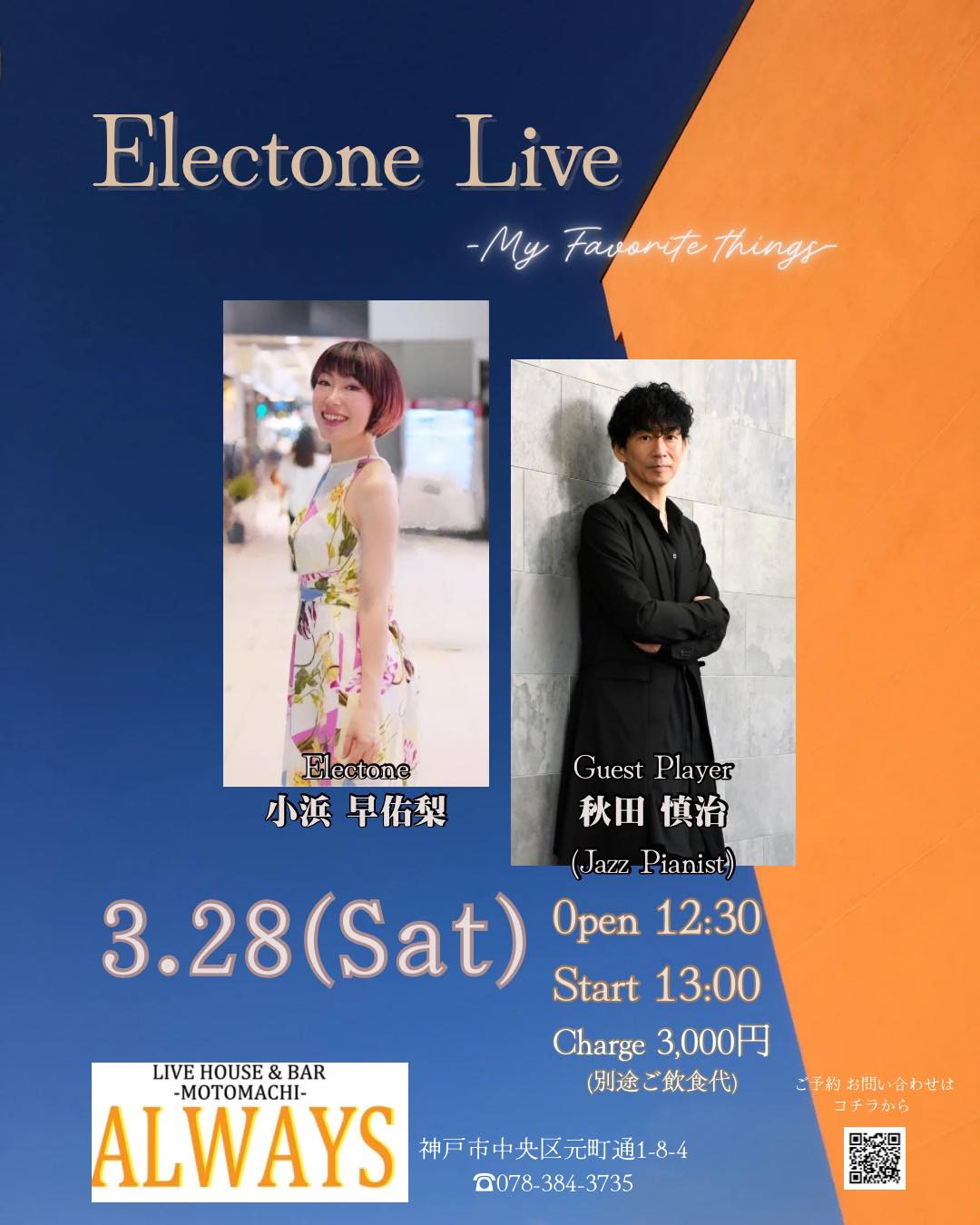 | 28日(土)昼 | Electone Live![]() エレクトーン 小浜 早佑梨 ゲスト 秋田 慎治(Jazz Pianist) Open12:30 Start 13:00 Charge ¥3,000 (要別途1drオーダー) ご予約フォーム https://forms.gle/8Vd56bDqVE8HtLNF8 |