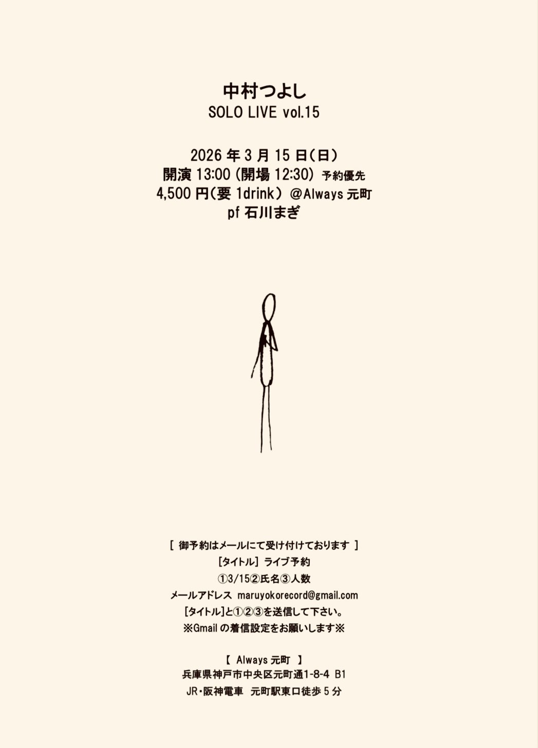 | 15日(日)昼 | 中村つよし SOLO LIVE vol.15![]() Open12:30 Start 13:00 Charge (要別途1drオーダー) ¥4,500 ※ご予約優先制※ |