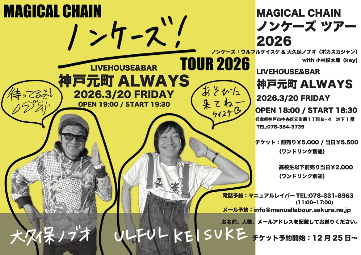 | 20日(金)夜 | MAGICAL CHAIN ノンケーズ ツアー2026 ![]() ノンケーズ [ウルフルケイスケ&大久保ノブオ(ポカスカジャン)with 小林俊太郎(key)] Open18:00 Start 18:30 Charge (要別途1drオーダー) 当日¥5,500 /ご予約¥5,000 |