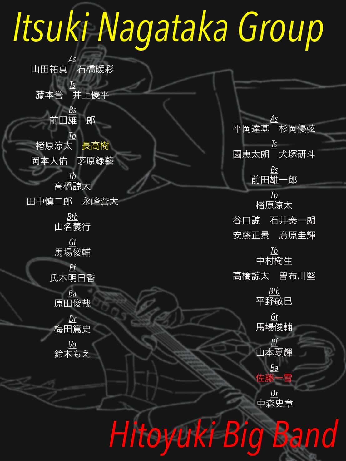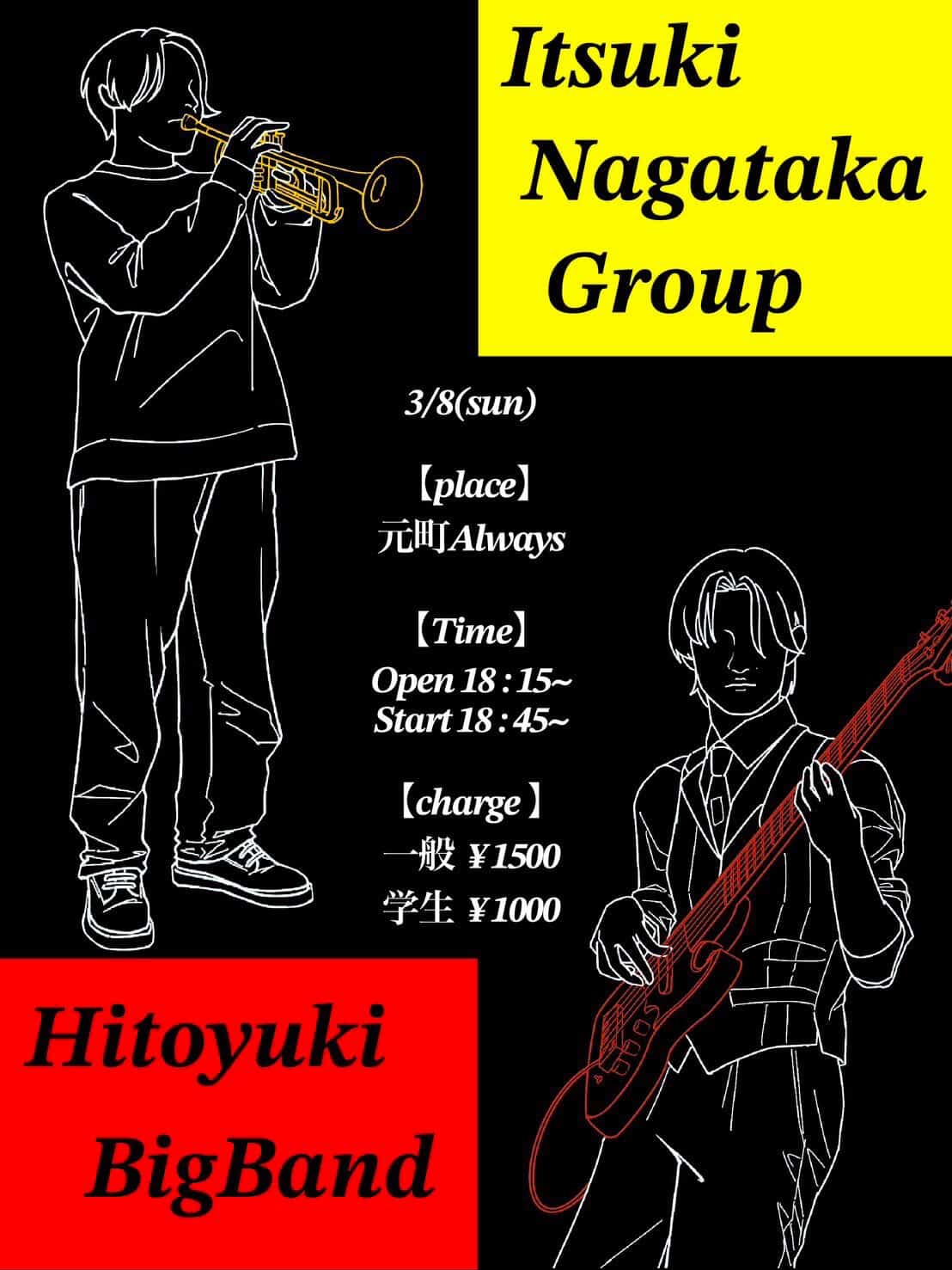 | 8日(日)夜 | Ituki Nagataka Group & Hitoyuki BigBand![]() ![]() Open18:15 Start 18:45 Charge (要別途1drオーダー) 一般¥1,500/学生¥1,000 |