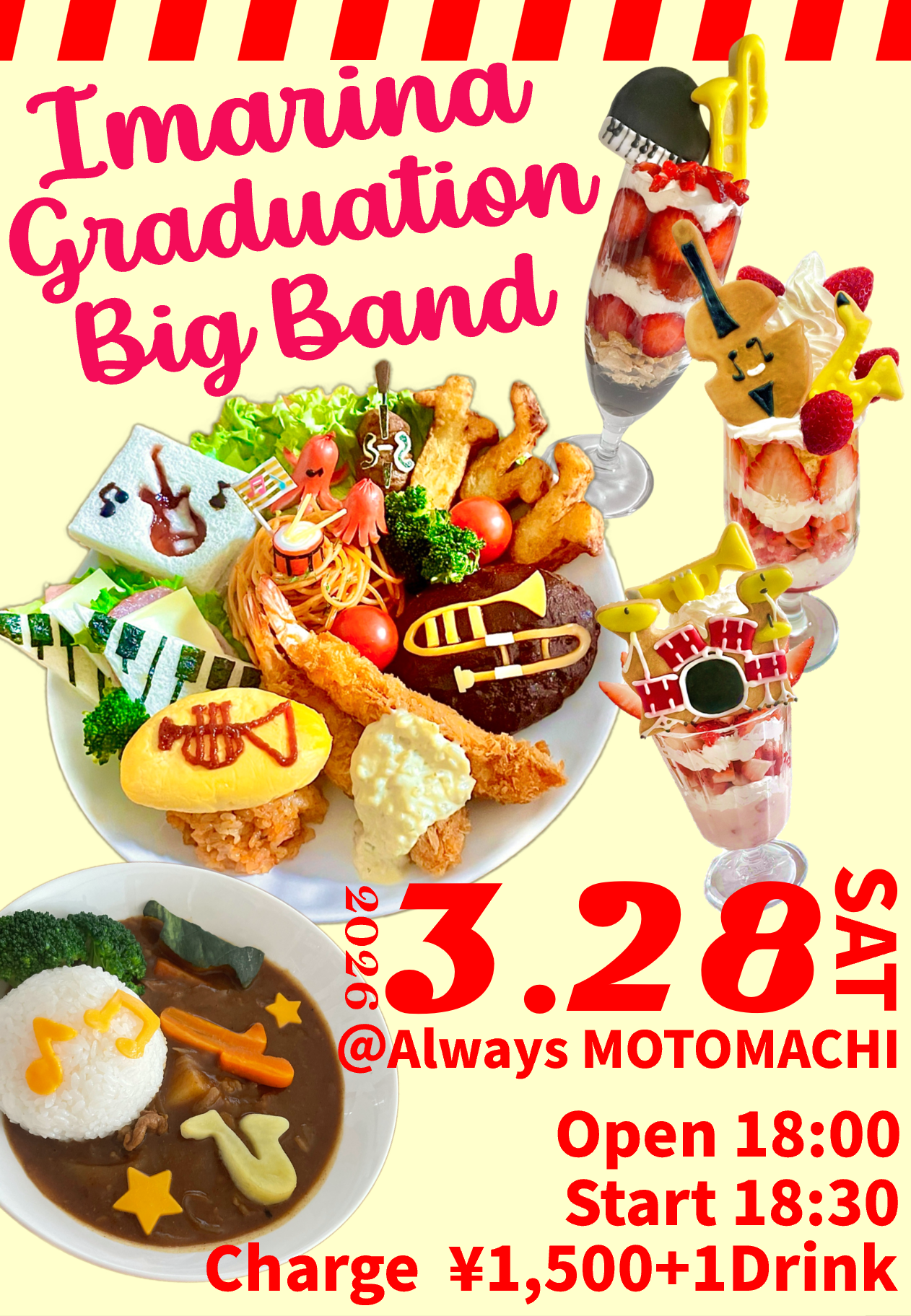 | 28日(土)夜 | Imarina Graduation BigBand![]() ![]() Open18:00 Start 18:30 Charge ¥1,500 (要別途1drオーダー) |