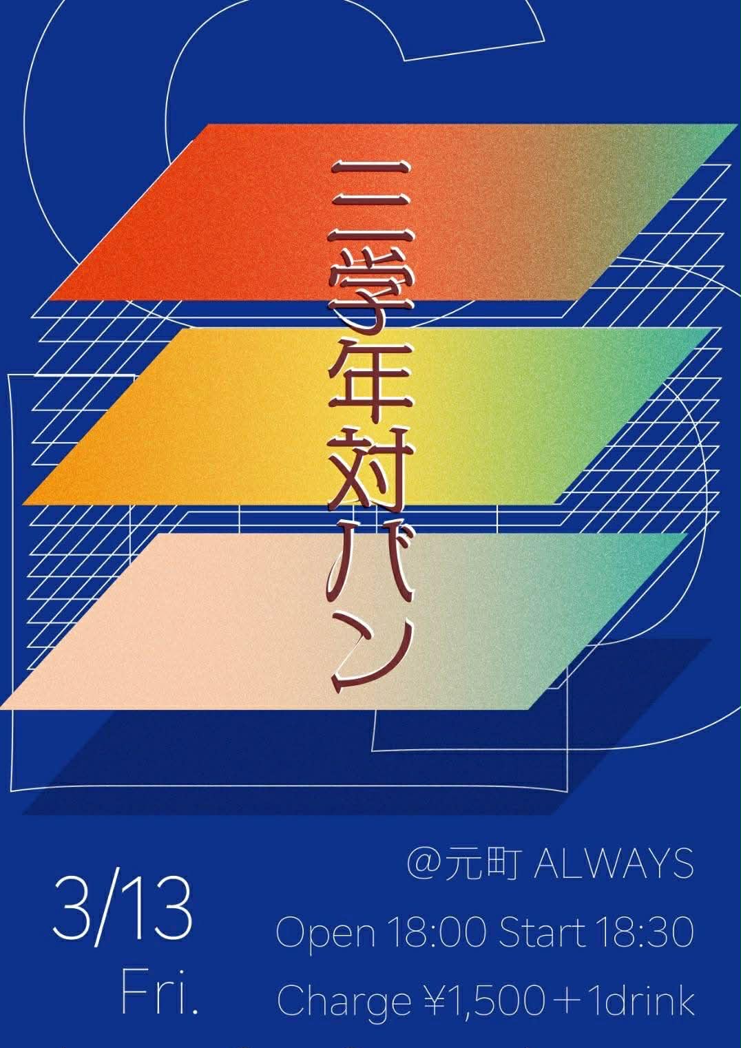 | 13日(金) | 三学年対バン![]() ![]() Open18:00 Start 18:30 Charge ¥1,500 (要別途1drオーダー) |