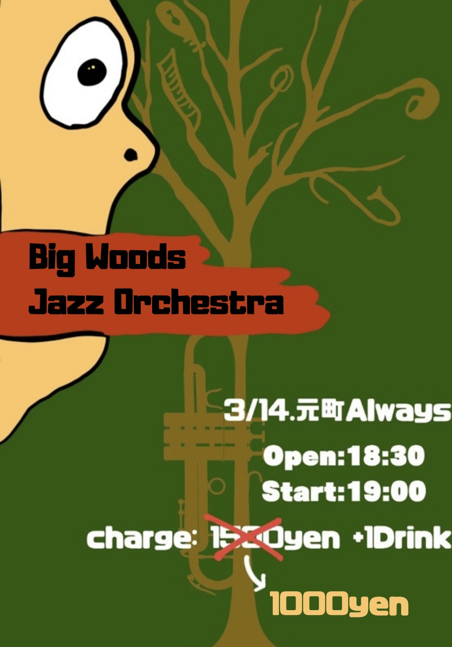 | 14日(土)夜 | Big Woods Jazz Orchestra ![]() Open18:30 Start 19:00 Charge ¥1,000 (要別途1drオーダー) |