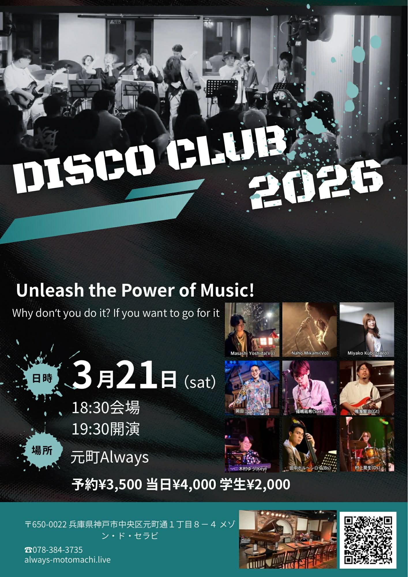 | 21日(土)夜 | DISCO CLUB 2026![]() Yoshida Masashi(Vo) Naho Mikami(Vo) Miyako Kubota(Vo) 岡田コースケ(Tp) 篠嶋祐希(Sax) 鳴海賢治(Gt) 木村ゆう(Key) 田中ホルヘシロウ(Bs) 村上晃生(Ds) Open18:30 Start 19:30 Charge (要別途1drオーダー) 一般 ご予約¥3,500 /当日¥4,000/学生¥2,000 |