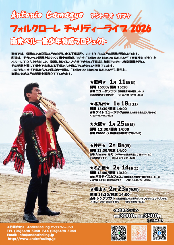 | 8日(日)昼 | フォルクローレ チャリティライブ2026![]() Antonio Camaque Open13:30 Start 14:00 Charge (1dr付) ご予約¥3,000 /当日¥3,500 |