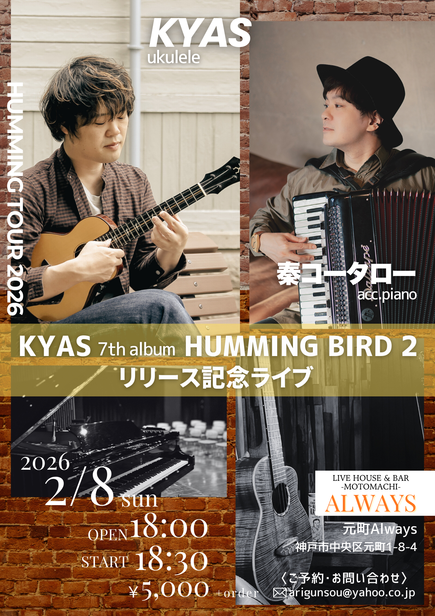 | 8日(日)夜 | KYAS 「HUMMING TOUR2026」 HUMMING BIRD2 リリースライブ ![]() KYAS(Ukulele) 秦コータロー(acc.piano) Open18:00 Start 18:30 Charge ¥5,000 (要別途1drオーダー) ご予約は arigunsou@yahoo.co.jp までご連絡ください |