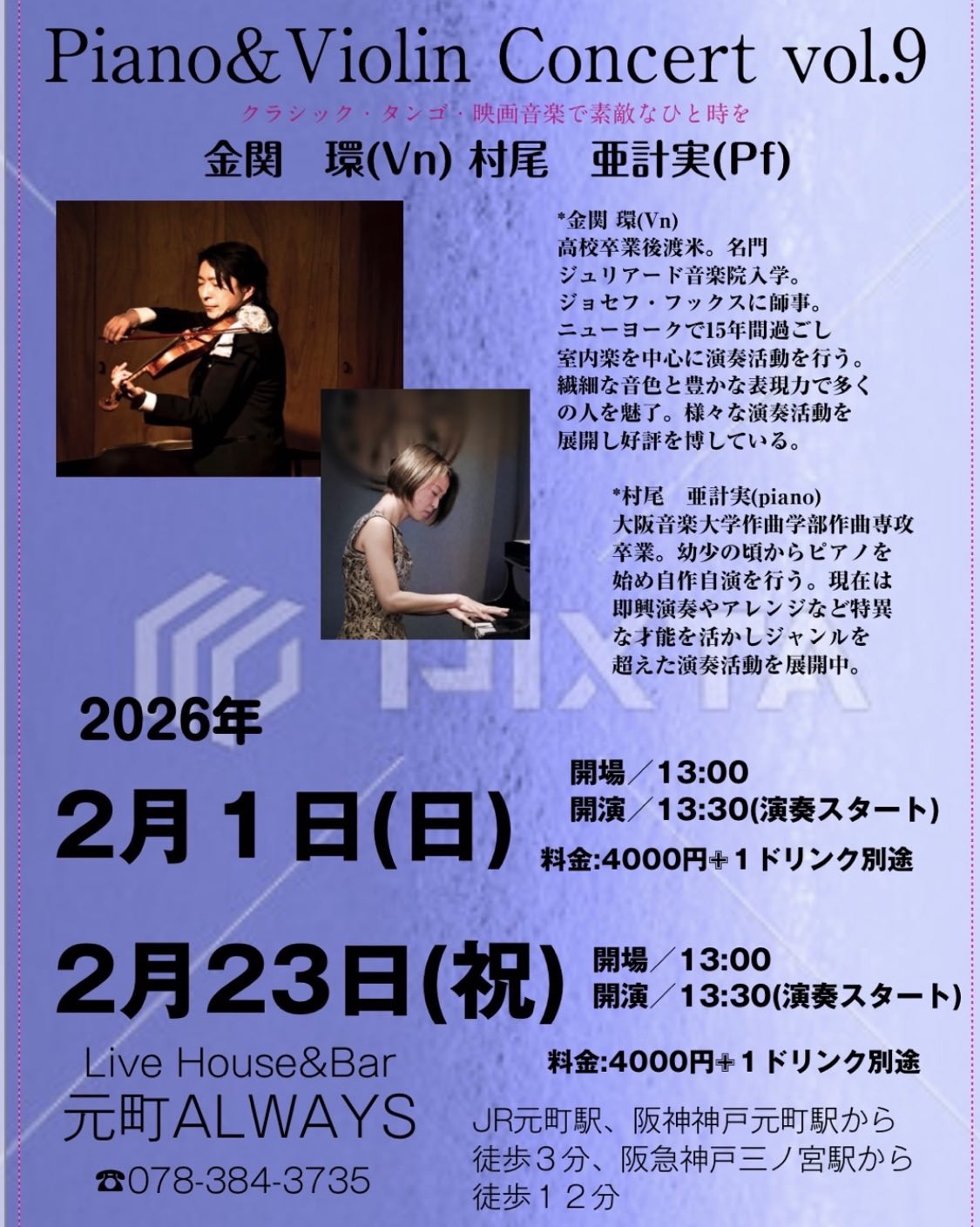 | 1日(日)昼 | Piano&Violin Concert vol.9![]() Open13:00 Start 13:30 Charge ¥4,000 (要別途1drオーダー) |