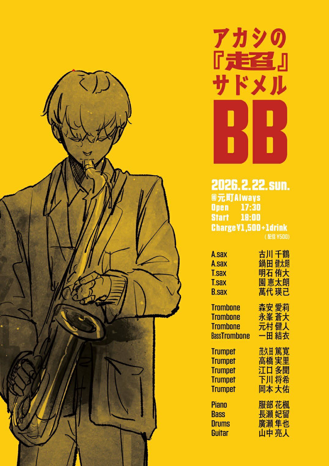 | 22日(日)夜 | アカシの『超』サドメルBB![]() Open17:30 Start 18:00 Charge ¥1,500 (要別途1drオーダー) |