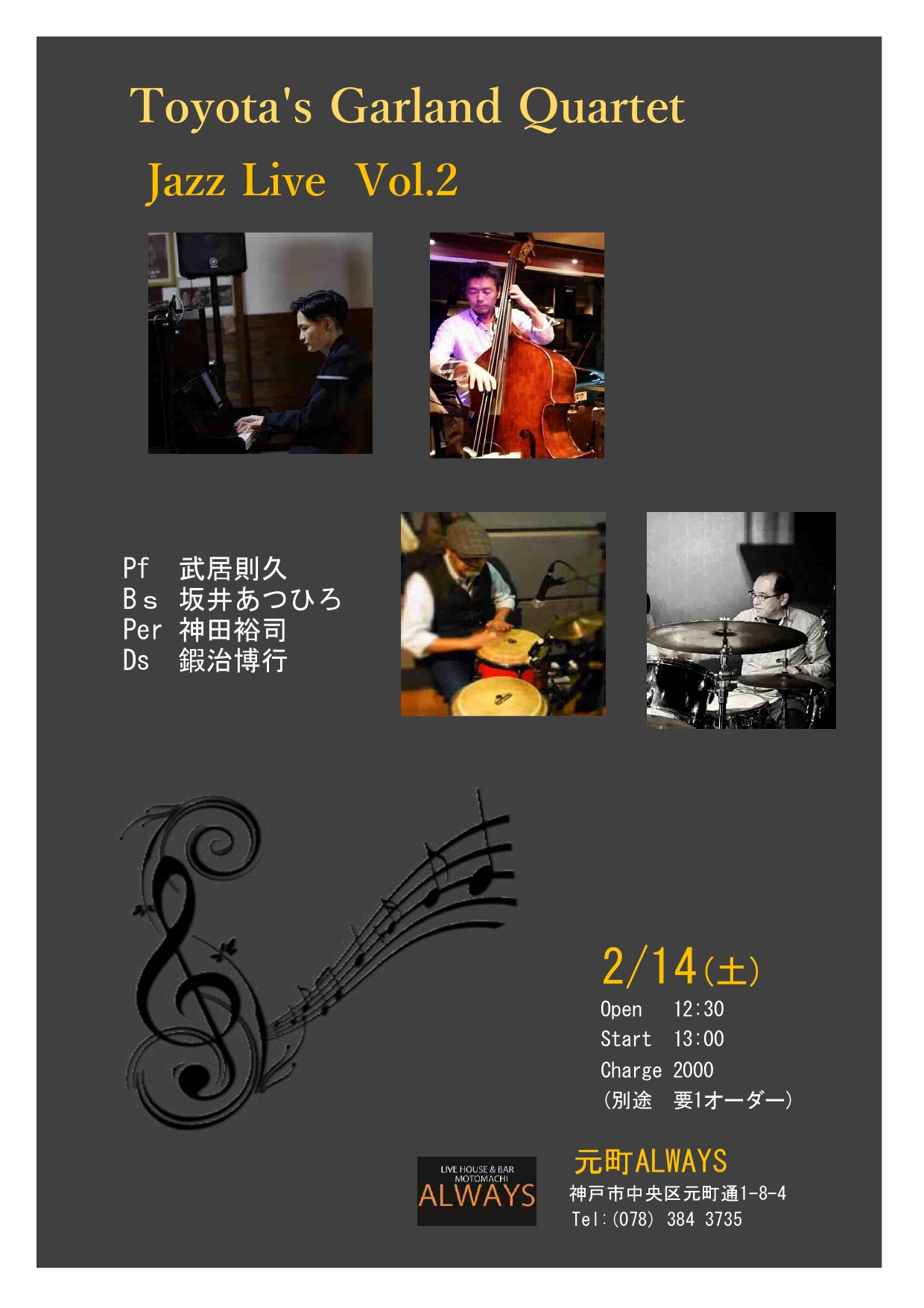 | 14日(土)昼 | Toyota’s Garland Quartet Jazz live vol.2 ![]() Open12:30 Start 13:00 Charge (要別途1drオーダー) ¥2,000 |