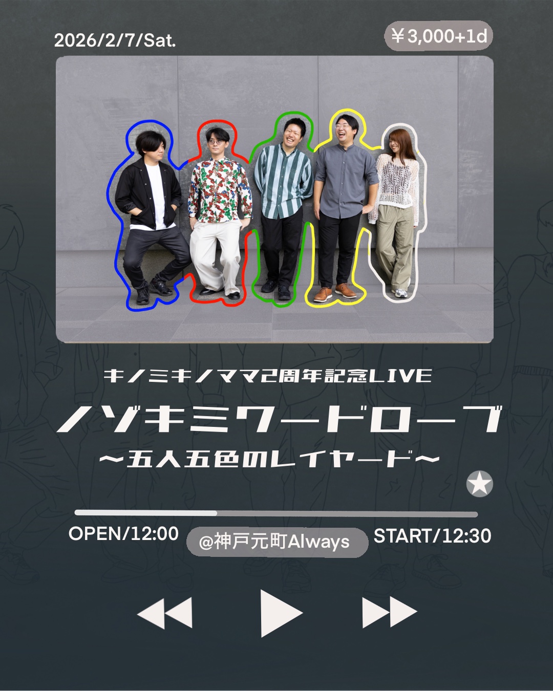 | 7日(土)昼 | ノゾキミワードローブ~五人五色のレイヤード~![]() Open12:00 Start 12:30 Charge ¥3,000 (要別途1drオーダー) |
